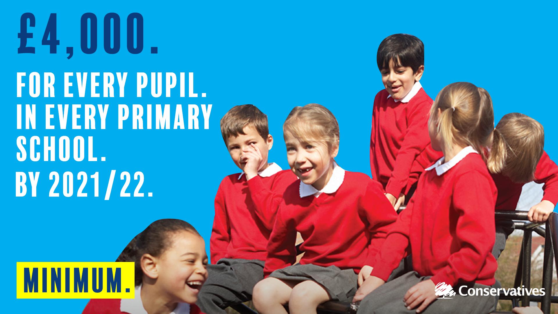 To help our schools, the Conservatives are investing an extra £14 billion in school funding, meaning £5,000 minimum funding per secondary school pupil by next year and £4,000 minimum funding per primary school pupil by 2021-22.